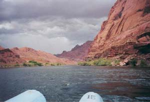 ![]() Nog steeds in het bootje over de rivier. Slecht weer is op komst. |